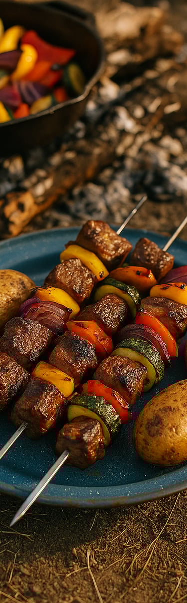 Brochettes de bœuf marinées façon barbecue, accompagnées de légumes grillés et pommes de terre au feu de bois